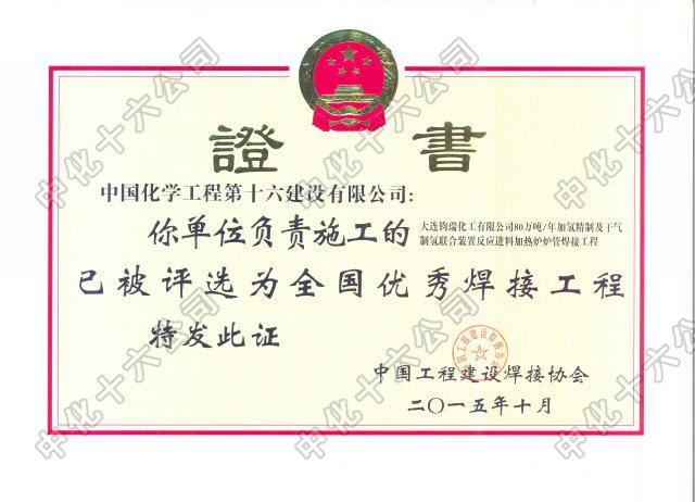 大连钧瑞化工80万吨年加氢精制及干气制氢联合装置优秀焊接工程奖