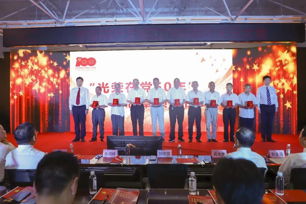 在慷慨激昂的《国歌》声中,本次活动正式拉开序幕,公司党委副书记、纪委书记何义波主持,党委书记、董事长刘佑锟和党委副书记、总经理张鸿峰为公司党龄达五十年的老党员代表颁发“光荣在党50年”纪念章,向他们送去公司的关怀和祝贺。