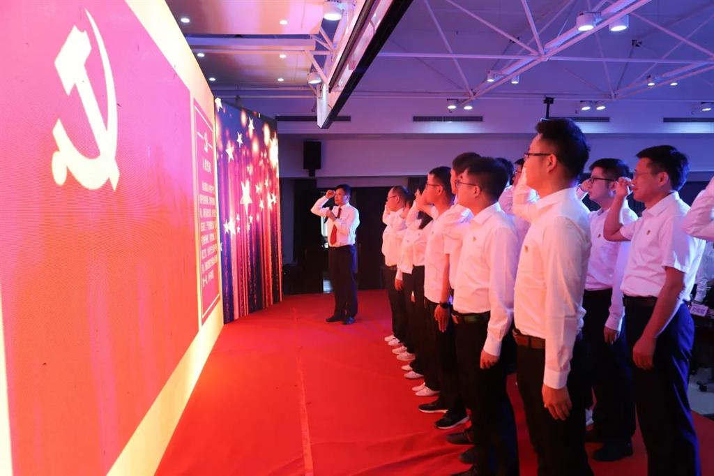 刘佑锟带领2021年新发展党员面向党旗庄严宣誓,全体党员重温入党誓词。